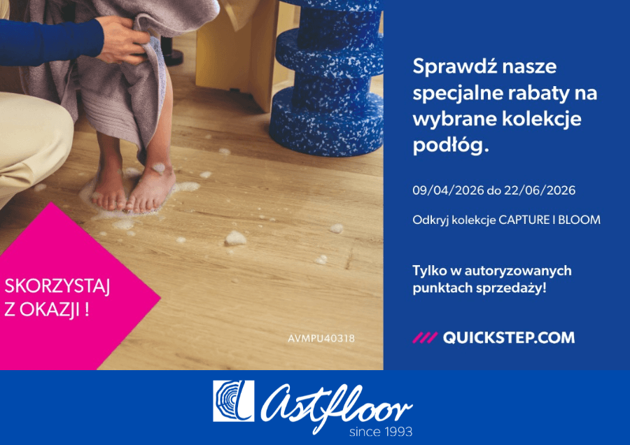 W salonach podłóg, drzwi i tarasów Astfloor Opole i Wrocław trwają wyjątkowe promocje Od 9 kwietnia do 22 czerwca 2026 r. lub do wyczerpania zapasów trwa promocja na panele Quick-Step z kolekcji Capture i Bloom. Obie kolekcje dostępne są w obniżonych cenach. Warto więc kupić jakościowe panele w salonach Astfloor we Wrocławiu (Bielany Wrocławskiej) oraz Opolu (ul.