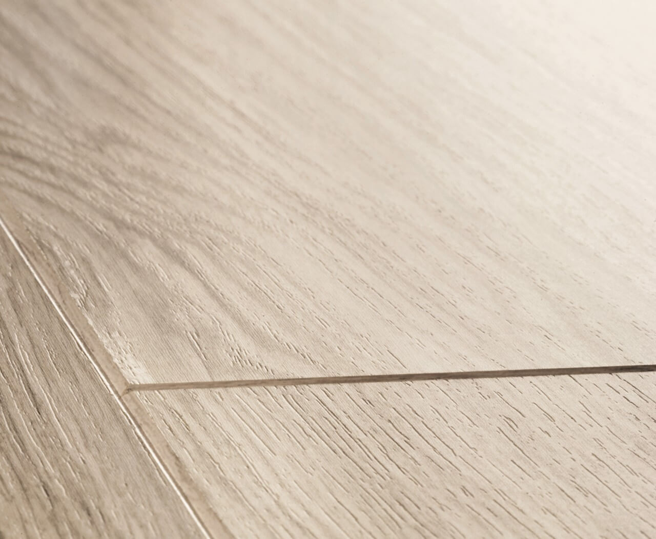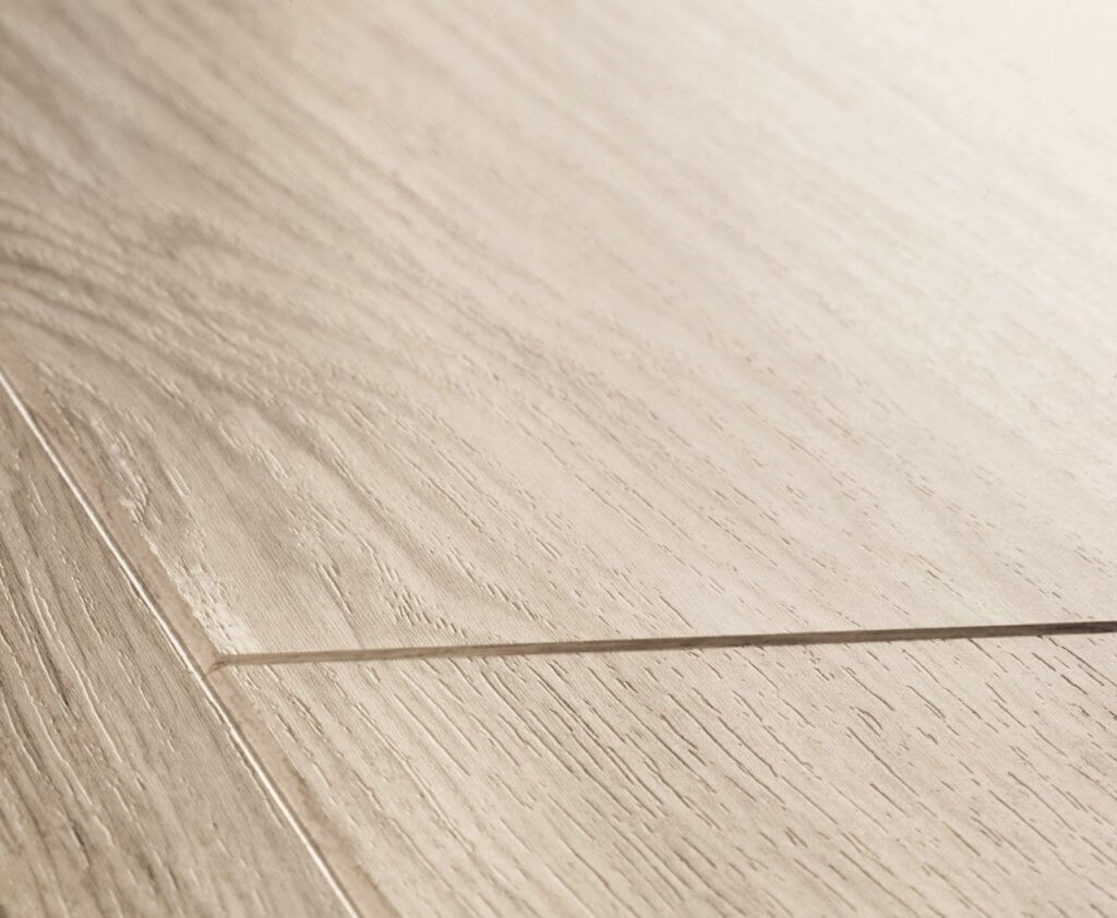 Jeżeli przeszkadza Ci efekt płaskiej podłogi to panele z v-fugą są dla Ciebie. To świetny wybór także dla miłośników drewna, którzy szukają idealnego odwzorowania naturalnego materiału. Dzięki rowkom panele laminowane jeszcze lepiej oddają charakter drewna. Natomiast frezy wykonane na dłuższych krawędziach sprawiają wrażenie podłogi ułożonej z długich desek, a frezy wykonane z każdej strony paneli imitują krótkie deski. Poniżej zdjęcie podłogi laminowanej dąb jasnoszary satynowy od Quick-Step, na którym widać wyraźnie v-fugi i efekt jeszcze lepszego odwzorowania podłogi drewnianej.