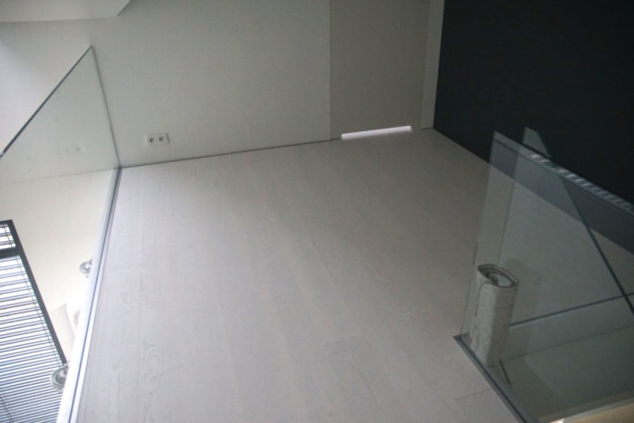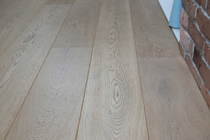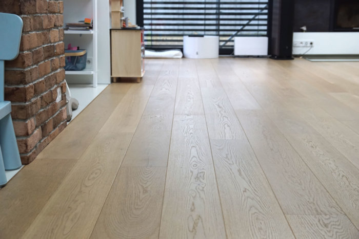 Na piętro inwestor wybrał podłogę drewnianą Jesion Lemon Sorbet z barlineckiej kolekcji Testes of Life. Jest to bardzo ciekawa i nowoczesna podłoga drewniana o odcieniu cytrynowego sorbetu. Pokrywa ją biały, matowy lakier. Strukturę drewna podkreśla szczotkowanie. Na całości podłogi delikatnie przejawiają się naturalne cechy wizualne drewna.