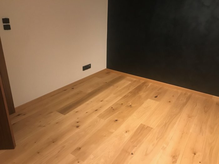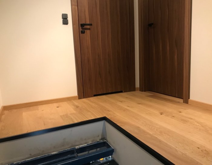 Kolonia Gosławicka to ta dzielnica Opola, którą opolanie wybierają najczęściej – jako miejsce budowy domu, czy też kupna mieszkania od developera (świetne położenie, świetna infrastruktura). W tym nowym domu w zabudowie szeregowej zamontowaliśmy olejowaną podłogę dębową (Deska Barlinecka) na całej górnej kondygnacji. Idealnie ociepla nowoczesny wystrój wnętrz. Listwa przypodłogowa również ma kolor dębu. Z kolorem podłogi oraz białymi i czarnymi ścianami dobrze komponują się zamontowane przez nas drzwi Pol-Skone w naturalnej okleinie orzecha.