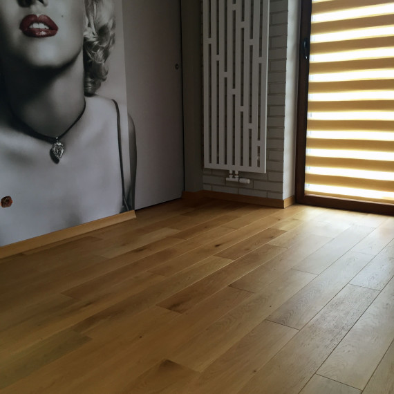 Nasza realizacja w Gałązczycach jest świetnym przykładem idealnego połączenia, które tworzą dwa elementy wnętrza: podłoga dębowa – Dąb lity lakierowany oraz drzwi Pol-Skone Calypso. Do Astpolu należał dobór koloru podłogi, przyklejany montaż podłogi, montaż listew oraz montaż drzwi.