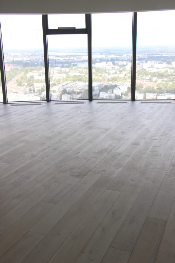 Wśród naszych najbardziej prestiżowych realizacji znalazły się apartamenty w najwyższym budynku Wrocławia – Sky Tower. Położyliśmy tam podłogi drewniane, które zachwycają pięknem, funkcjonalnością i trwałością. Wrocławski Sky Tower to miejsce łączące funkcje biznesowe, usługowe i mieszkalne. Właśnie tam należało postawić na najlepsze materiały. Nasza realizacja w apartamencie pokazowym oparta została o luksusowe, szczotkowane deski dębowe (dąb warstwowy olejowany, wyselekcjonowany, szczotkowany, faza czterostronna). Nim zamontowaliśmy podłogi, zajęliśmy się doborem odpowiedniego rodzaju, koloru i przygotowaniem podłoża. Po pięknie wykonanych podłogach drewnianych w tym położonym na 47. pietrze apartamencie ze wspaniałym widokiem na Wrocław, zamontowaliśmy kolejne podłogi drewniane w Sky Tower. Tym razem oczarowani inwestorzy postawili na jasny dąb (dąb warstwowy, biały olej, rustykalny, szczotkowany), który wspaniale rozświetlił przestrzeń apartamentu.