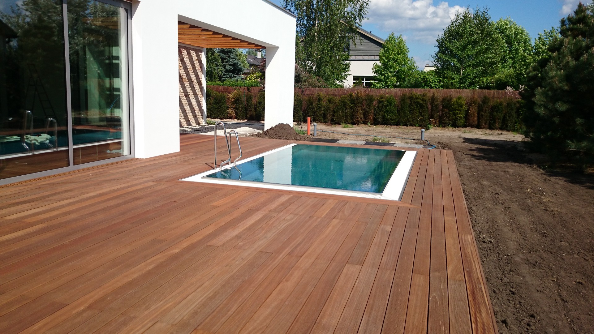 Nasza kolejna realizacja w Wysokiej koło Wrocławia opierała się na montażu pięknego ok. 200 metrowego tarasu. Taras Bangkirai idealnie komponuje się z architekturą budynku i dopełnia przestrzeń wokół basenu zewnętrznego.