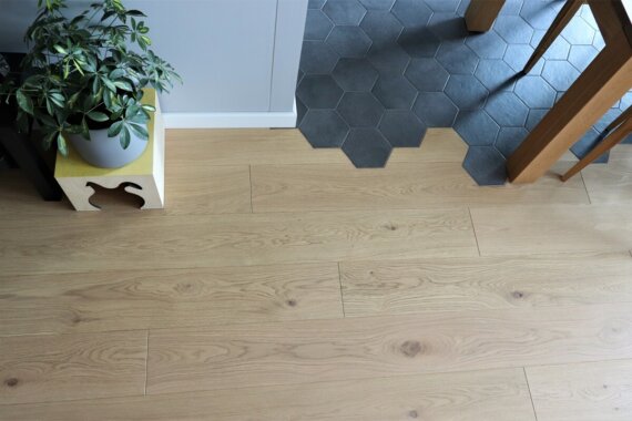 Jawor Dąb Elegance to wyjątkowe, długie i szerokie deski z kolekcji Luxury. Są kwintesencją dębowej elegancji o subtelnej, jasnej barwie z nielicznymi sękami i swobodnym przebiegiem słojów. Deskę zamontowaliśmy na niemal całej powierzchni (z wyjątkiem łazienki) 2-pokojowego apartamentu w jednym z nowych budynków w dzielnicy Malinka. Projektanci tego wnętrza zadbali, by było eleganckie i pełne