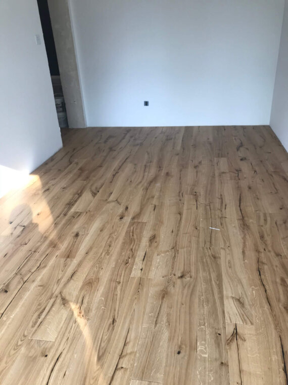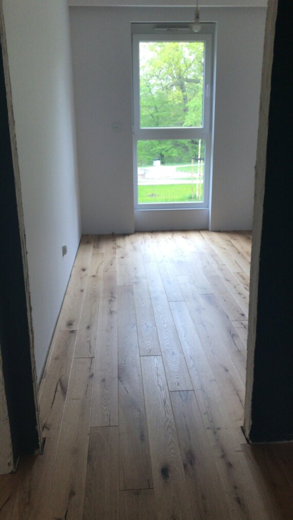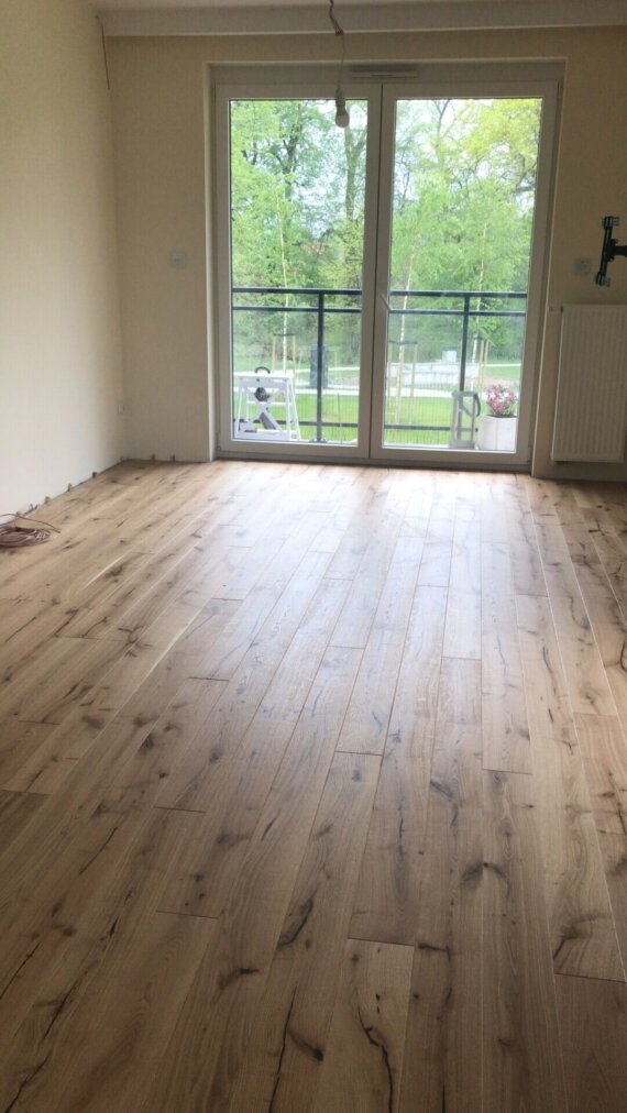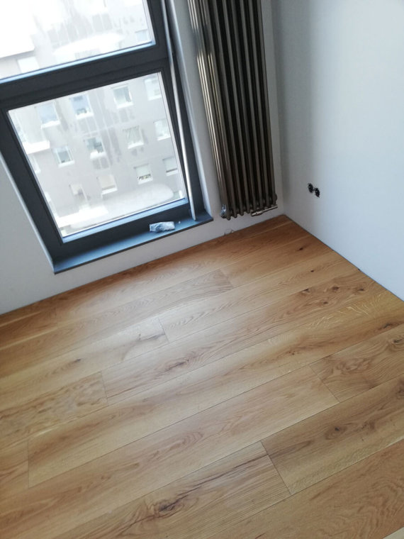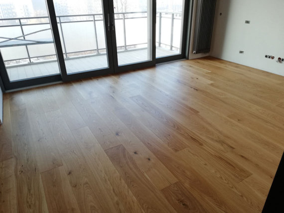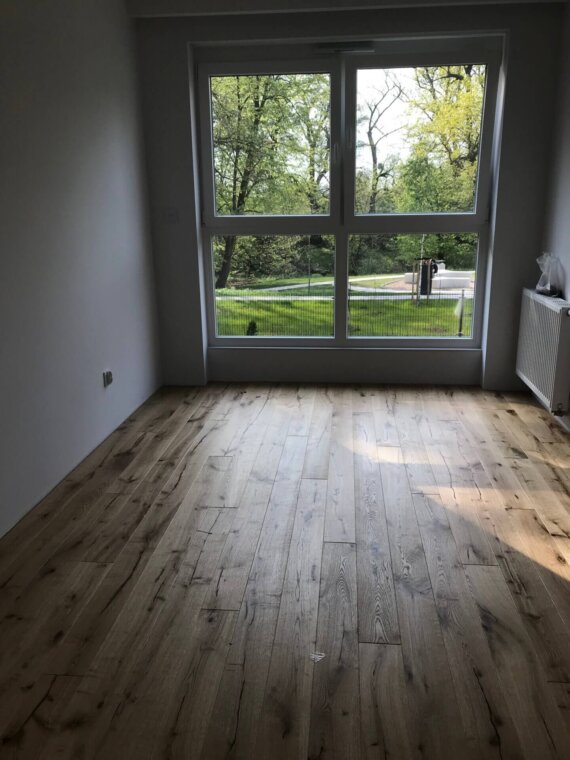 Wśród naszych najbardziej prestiżowych realizacji znalazły się apartamenty w najwyższym budynku Wrocławia – Sky Tower. Położyliśmy tam podłogi drewniane, które zachwycają pięknem, funkcjonalnością i trwałością. Wrocławski Sky Tower to miejsce łączące funkcje biznesowe, usługowe i mieszkalne. Właśnie tam należało postawić na najlepsze materiały. Nasza realizacja w apartamencie pokazowym oparta została o luksusowe, szczotkowane deski dębowe (dąb warstwowy olejowany, wyselekcjonowany, szczotkowany, faza czterostronna). Nim zamontowaliśmy podłogi, zajęliśmy się doborem odpowiedniego rodzaju, koloru i przygotowaniem podłoża. Po pięknie wykonanych podłogach drewnianych w tym położonym na 47. pietrze apartamencie ze wspaniałym widokiem na Wrocław, zamontowaliśmy kolejne podłogi drewniane w Sky Tower. Tym razem oczarowani inwestorzy postawili na jasny dąb (dąb warstwowy, biały olej, rustykalny, szczotkowany), który wspaniale rozświetlił przestrzeń apartamentu.
